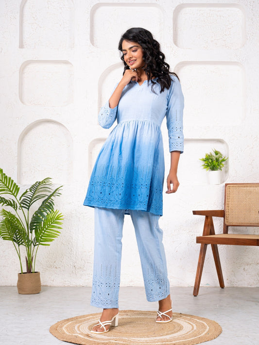 Cotton Shiffli Ombre Blue Co-ord Set