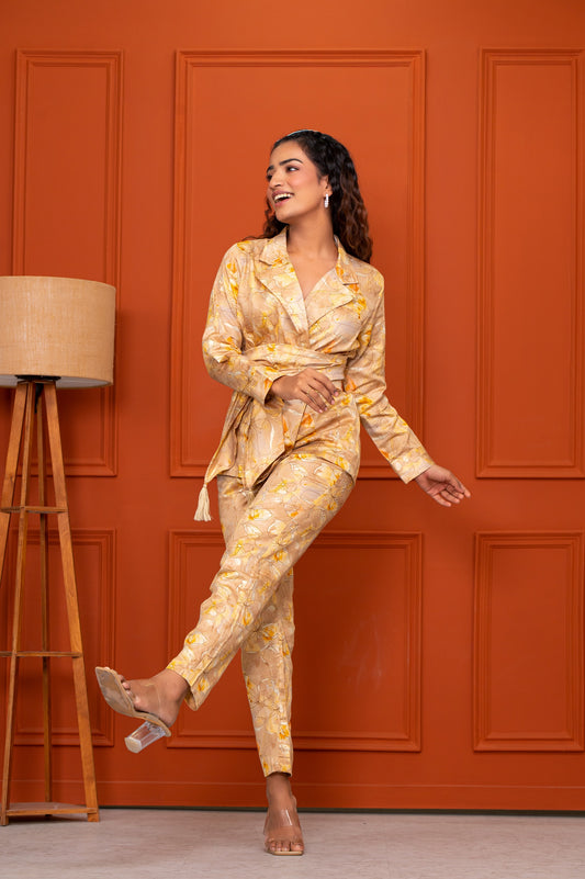 Jam Cotton Printed Yellow Blazer Belt Co-ord Set
