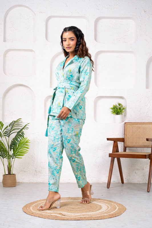 Jam Cotton Printed Blue Blazer Belt Co-ord Set