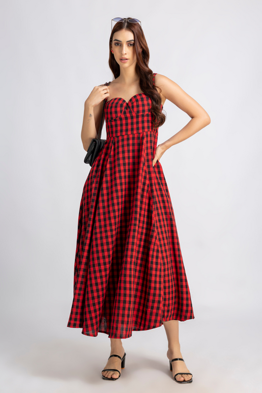 Crimson Check Midi Dress