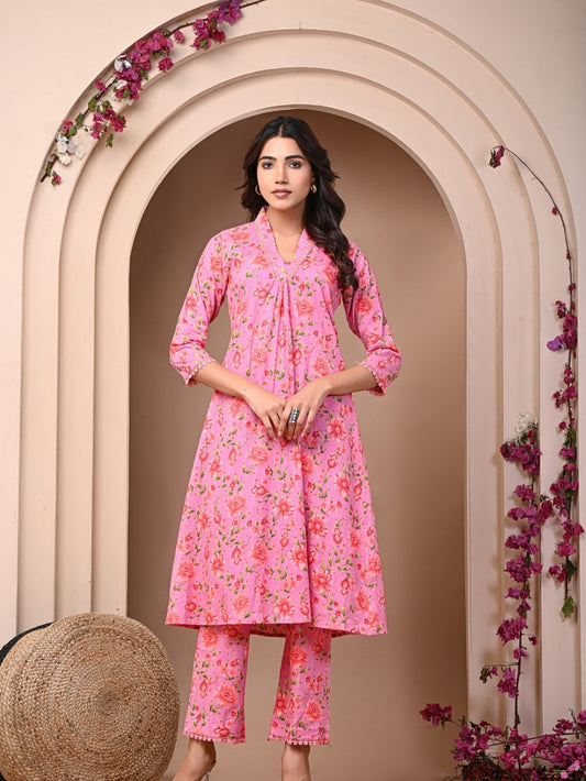 Pure Cotton Printed Mauve Pink Kurti & Pant Set