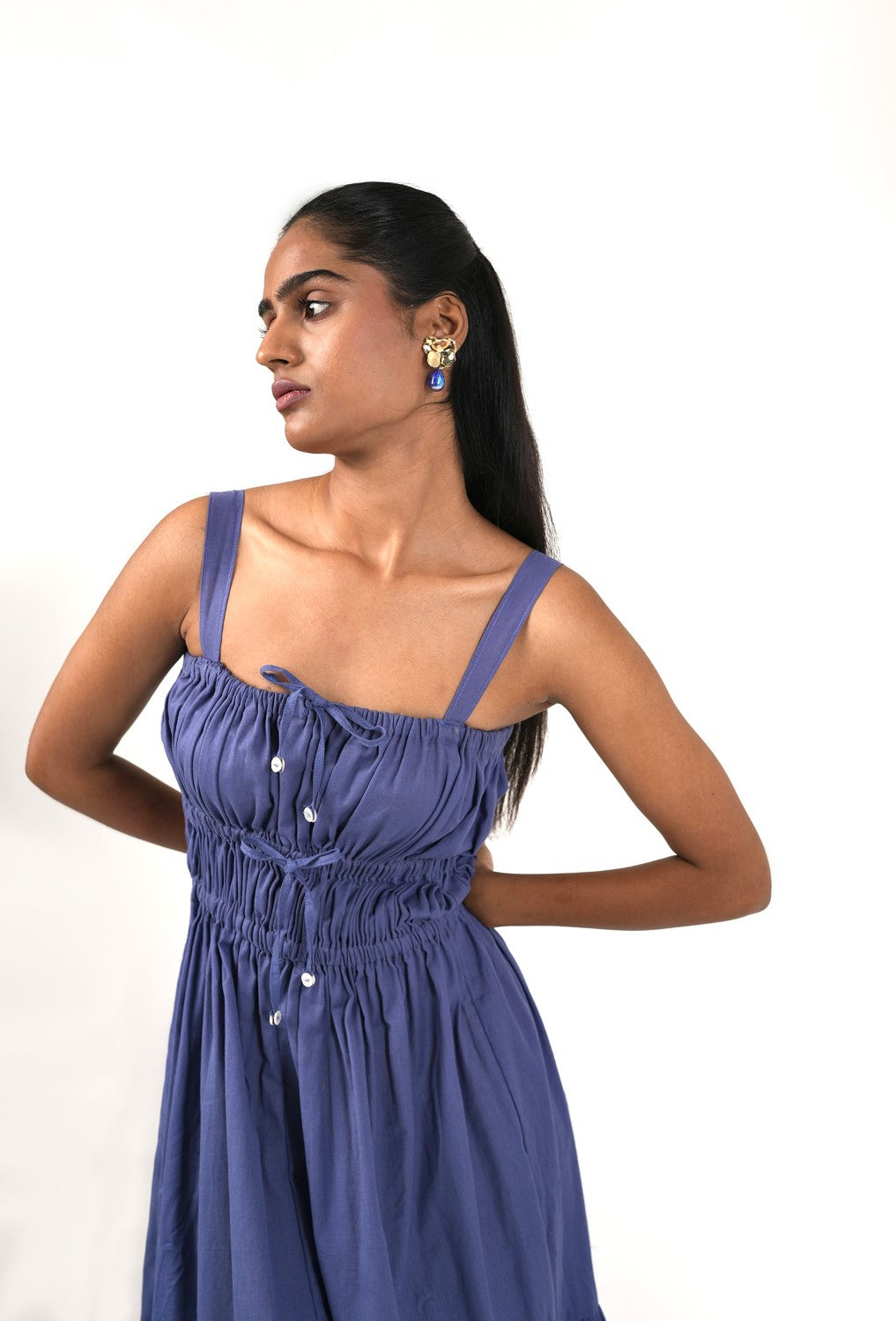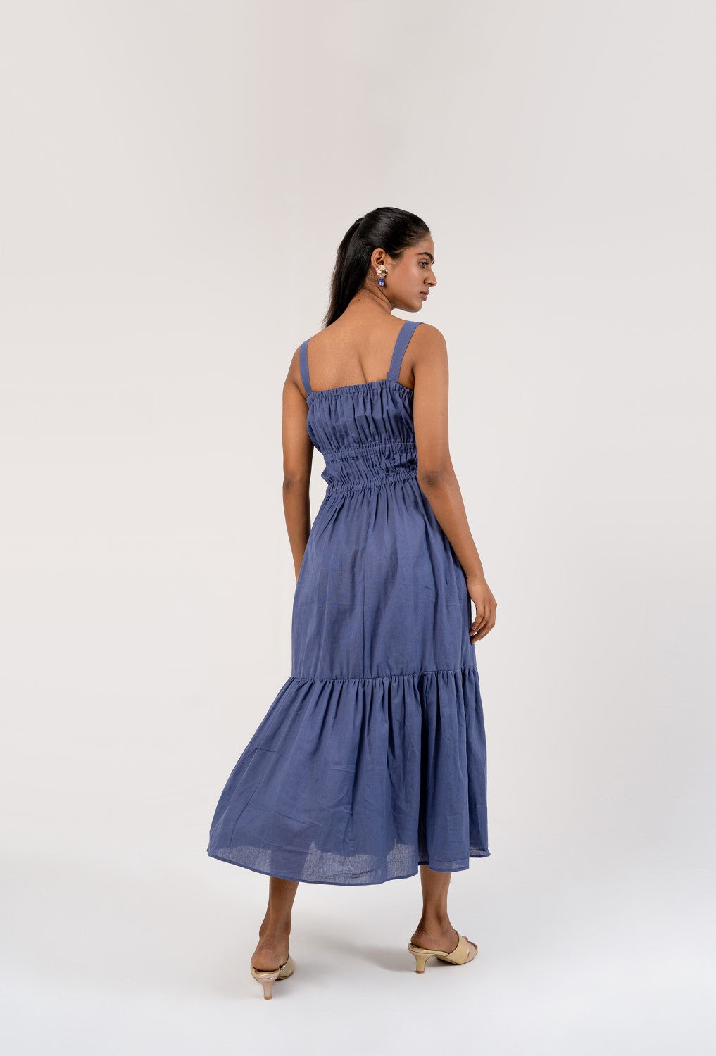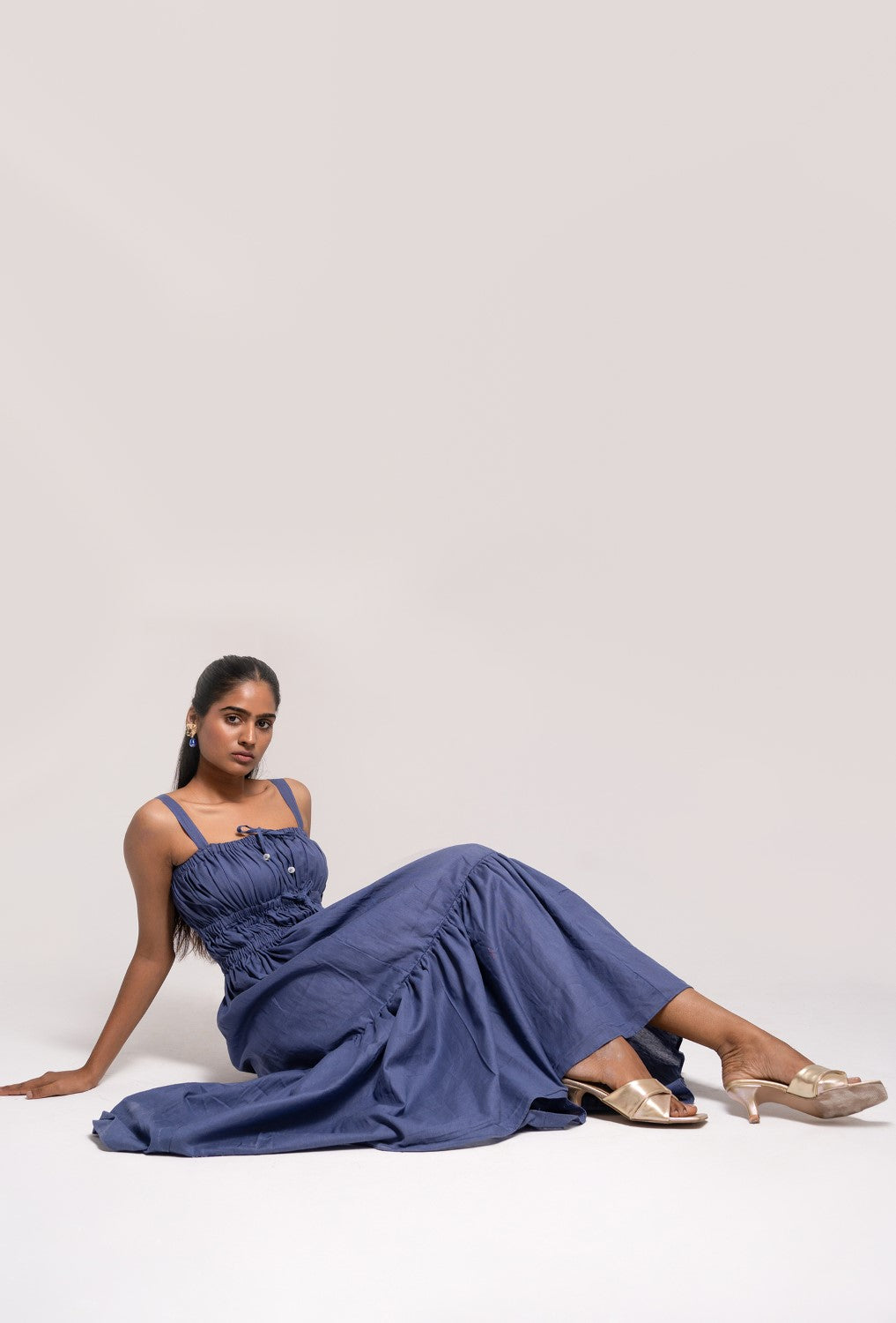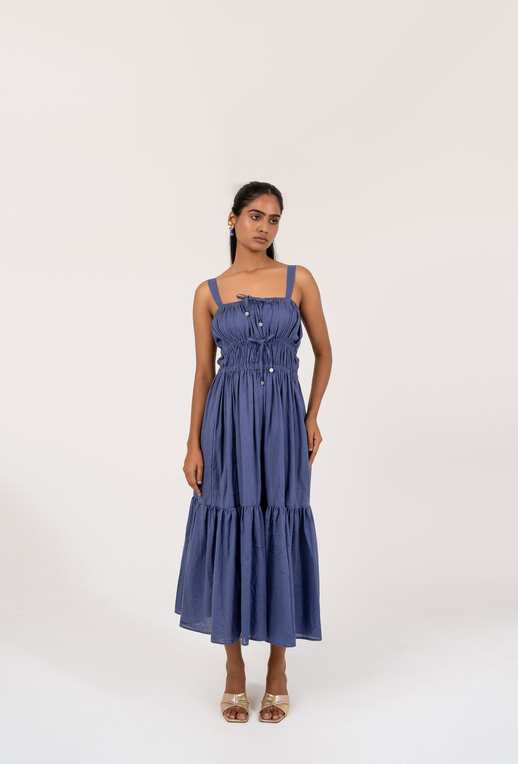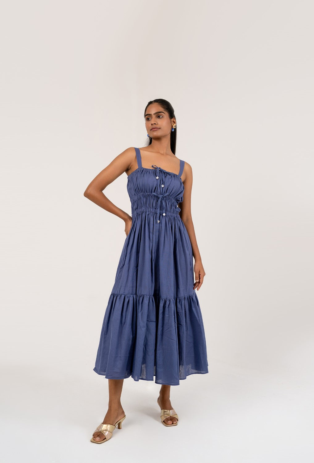 A dreamy cotton midi dress in a rich, dusky violet shade that evokes calm, cool evenings. Designed with a flattering ruched bodice and tie detail, this dress offers a flexible fit that hugs comfortably. White shell buttons and hand-embellished accents add subtle charm, while the tiered skirt flows beautifully with every step. Lightweight and breezy, it’s the perfect companion for twilight strolls, brunches by the sea, or vacation lounging with flair.