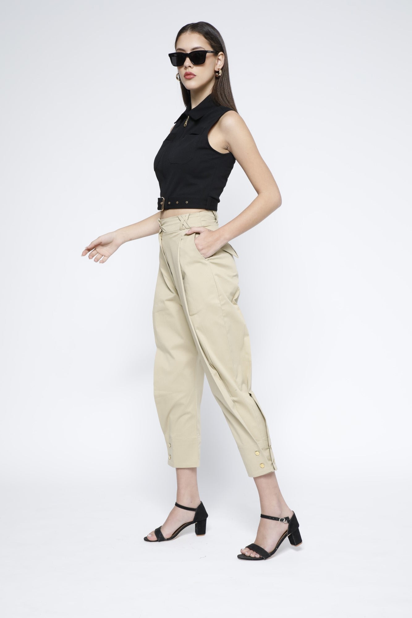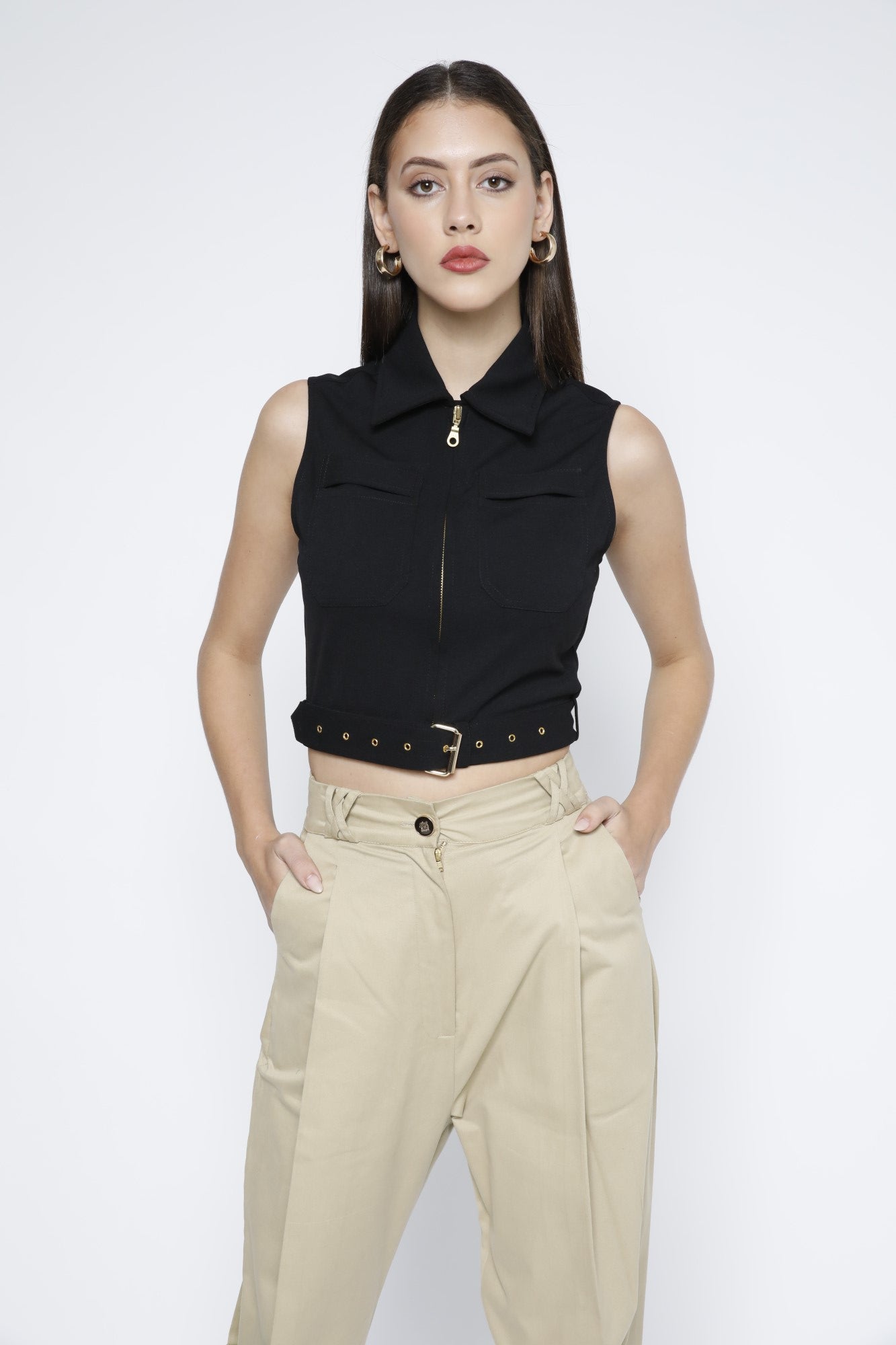 Make a statement at the party with our crop top featuring a front gold metal zip, and removable belt, made from a stretchy moss crepe fabric. Complete with a spread collar and front pocket, pair it effortlessly with shorts or a skirt and heels.