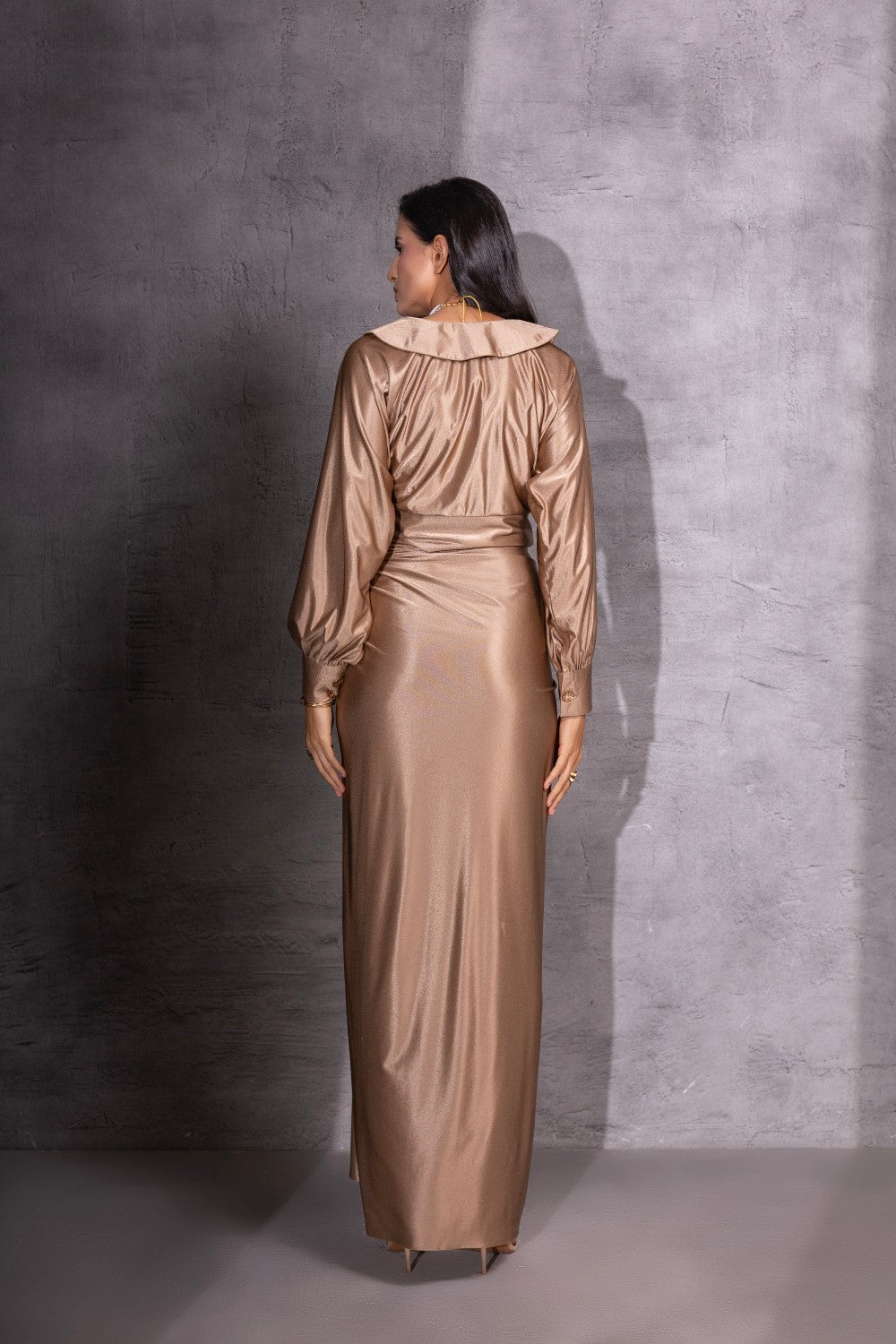 Step into the spotlight with this luxe golden co-ord set that perfectly blends modern glamour with timeless elegance. Designed for bold evenings and unforgettable occasions, this statement outfit features a fluid wrap-style top with voluminous sleeves and a subtle V neckline, creating a flattering silhouette that feels both powerful and feminine. The standout piece is the high-slit knotted skirt, artfully draped to enhance your curves and add graceful movement with every step. The intricate knot detail at the waist cinches you in while elevating the ensemble with a sculptural, couture-inspired touch.Crafted from a soft, luminous fabric with a satin-metallic finish, this set shimmers subtly under light, making it ideal for cocktail nights, festive gatherings, or high-fashion events.