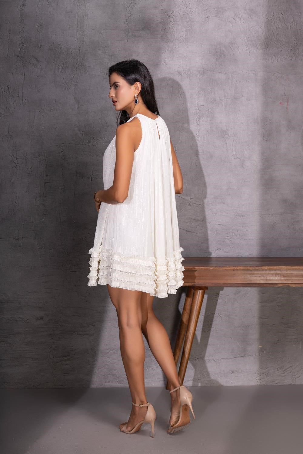 Make every moment sparkle with this eye-catching wine red flared mini dress, designed to steal the spotlight. Crafted with delicate fabric layered with shimmering sequins, this dress brings a perfect balance of glamour and playful charm. The sleeveless halter-style neckline gives it a chic, modern edge while allowing room to accessorize freely. The relaxed, flared silhouette adds effortless movement and comfort, making it ideal for parties, cocktail events, or a glam night out. The hem is finished with intricate ruffled sequin detailing, adding a touch of texture and drama to the look. Lined for comfort and designed to dazzle, this mini dress is your go-to choice when you want to feel bold, beautiful, and unforgettable. Style tip: Pair it with statement earrings, strappy heels, and a sleek clutch to complete the look. Lined for comfort and designed to dazzle, this mini dress is your go-to choice when you want to feel bold, beautiful, and unforgettable. .
