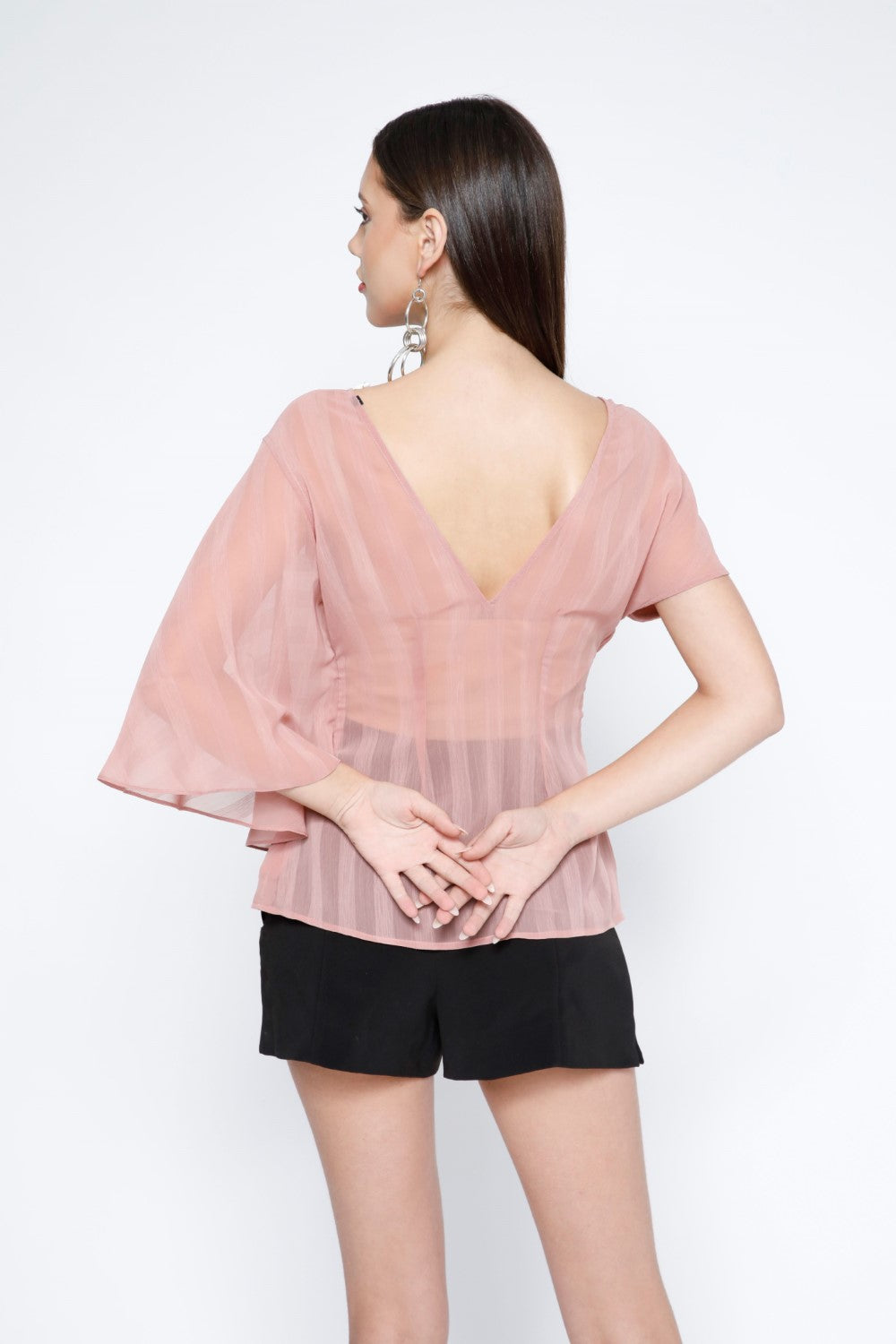 Radiate casual elegance in our sheer chiffon top, adorned with captivating self-stripes. Its flattering fit and pleated detailing accentuate the waist, while the V-neck and flared silhouette add chic charm. Pair with flats and shorts for a stylish night out with friends.