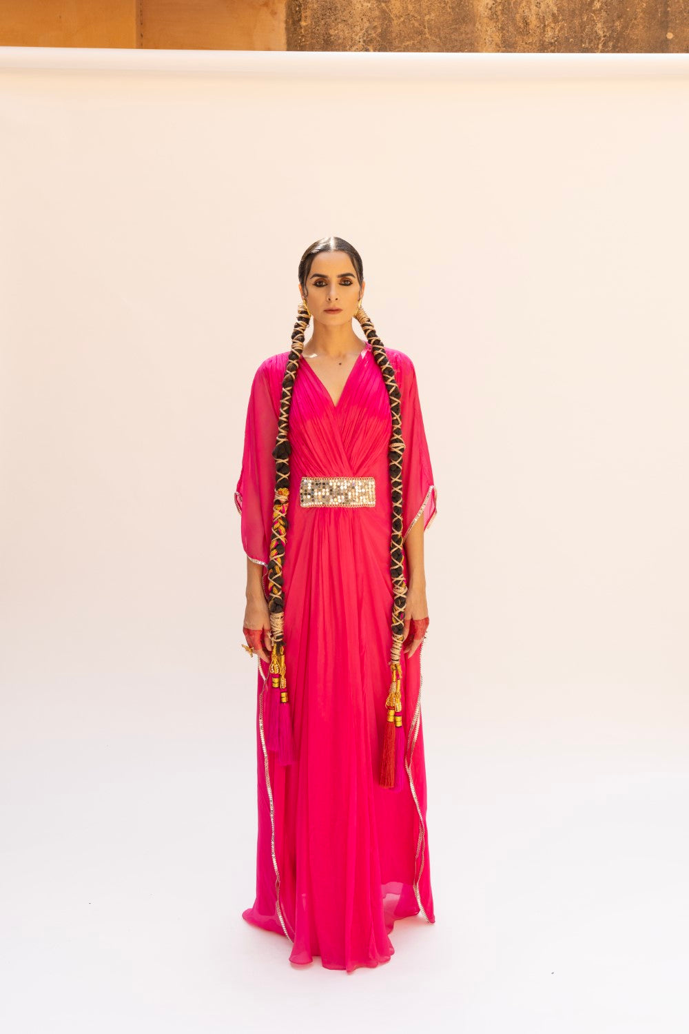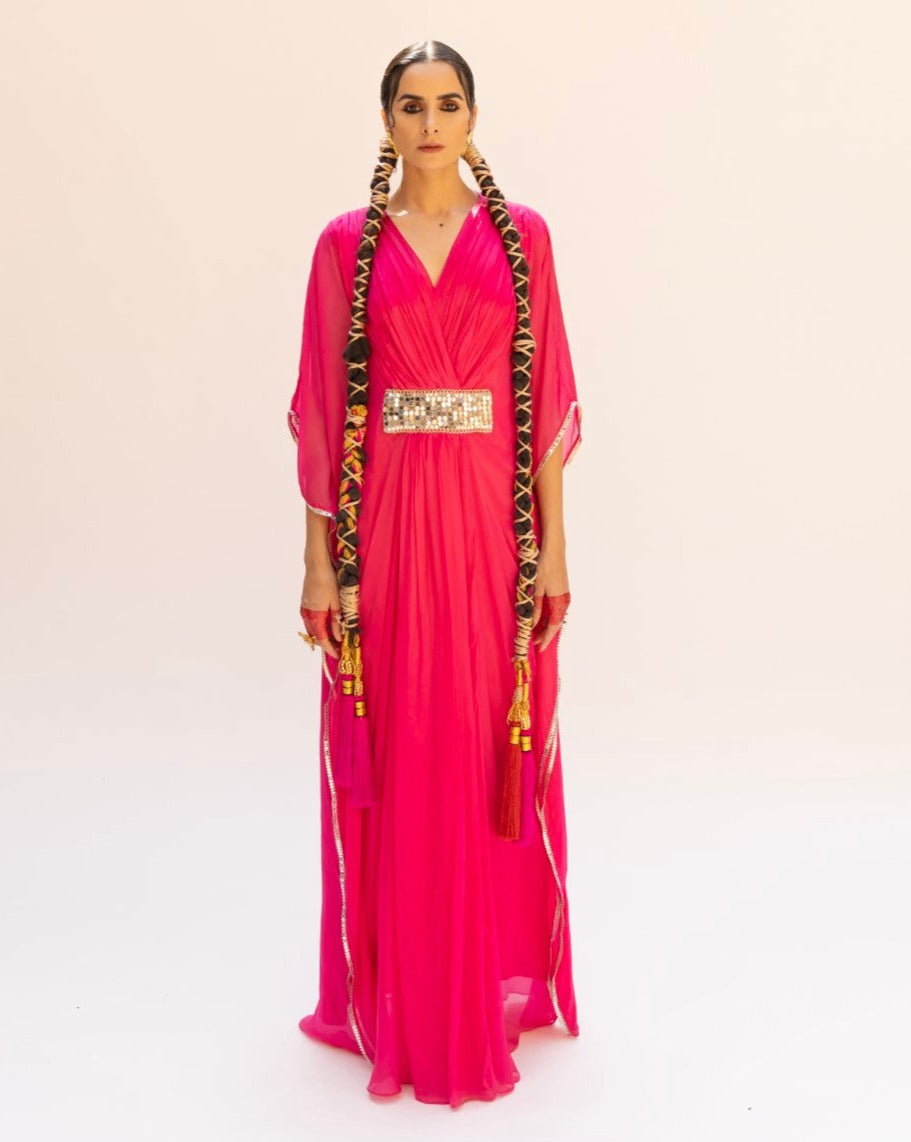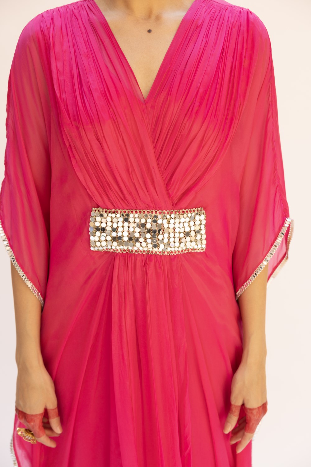 Vibrant Pink Silk Kaftan, featuring an overlapping V-neck and delicate gathers for an elegant drape. Adorned with a hand-embroidered mirror belt. Accompanied by a luxurious silk satin slip, this ensemble is a perfect blend of style and comfort.