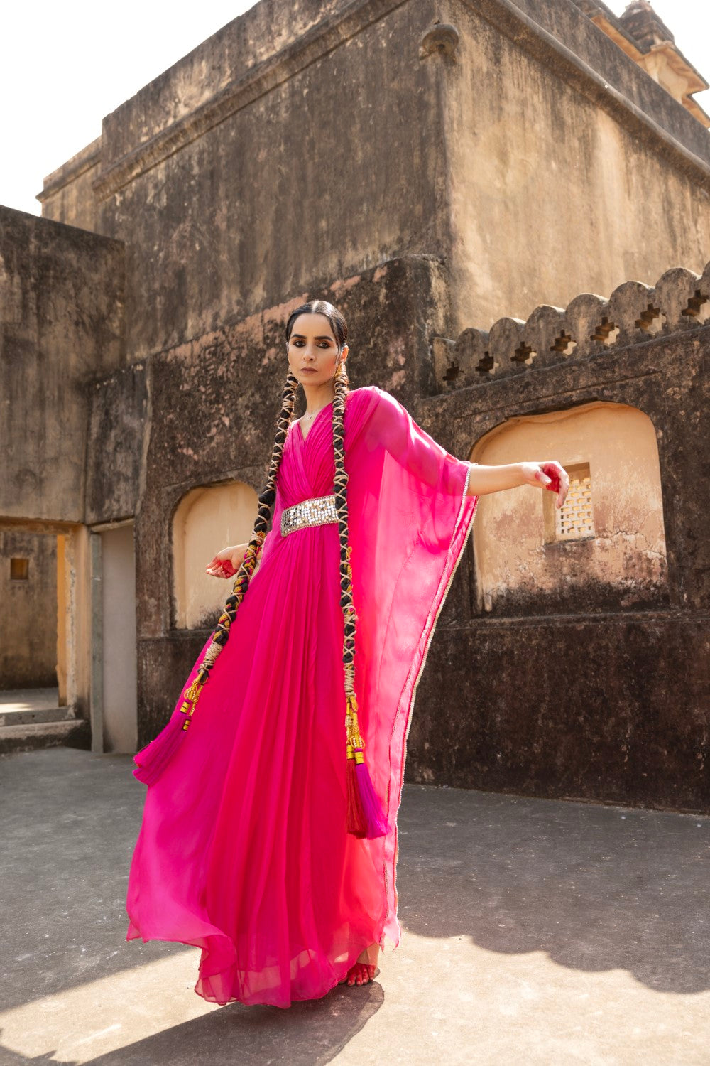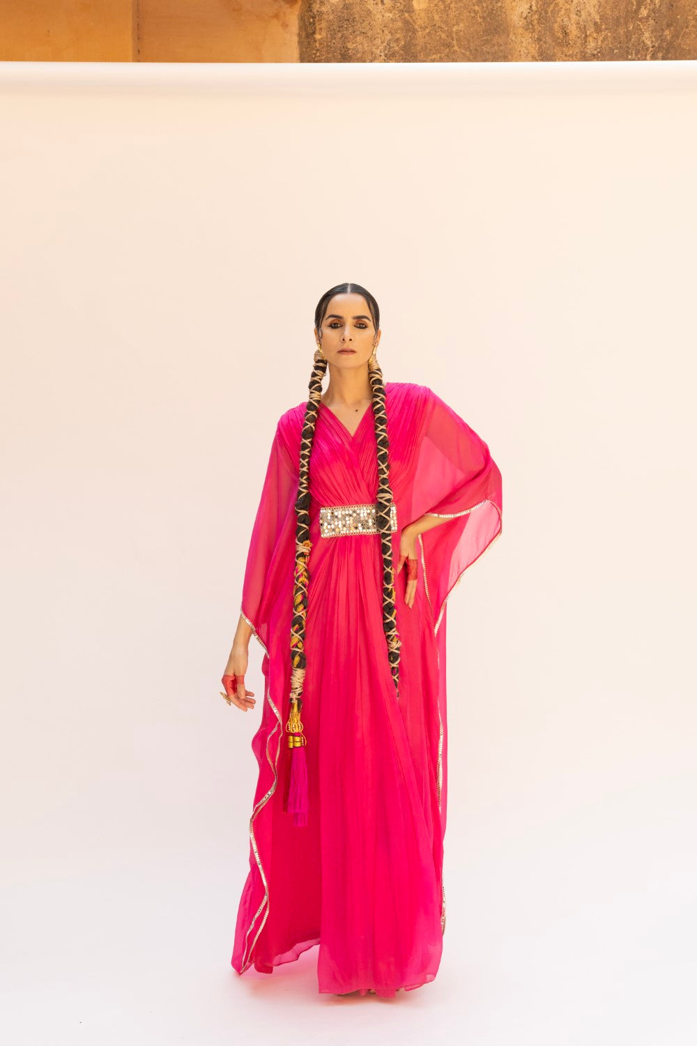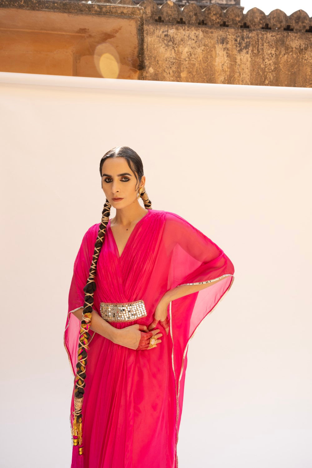 Vibrant Pink Silk Kaftan, featuring an overlapping V-neck and delicate gathers for an elegant drape. Adorned with a hand-embroidered mirror belt. Accompanied by a luxurious silk satin slip, this ensemble is a perfect blend of style and comfort.