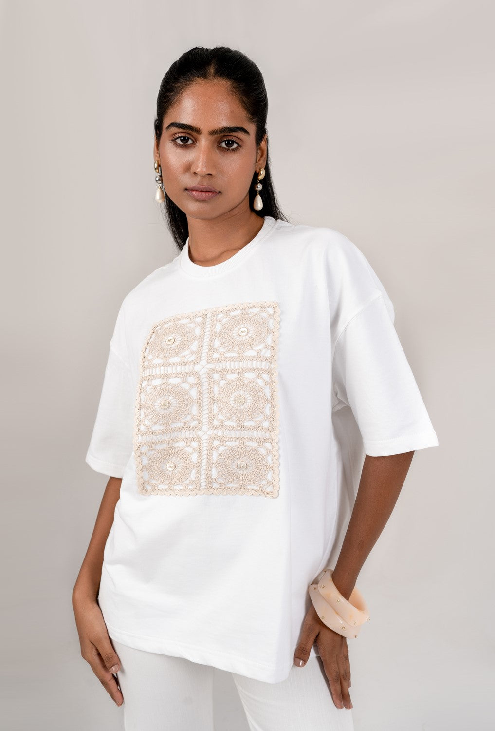 Easy, breezy, and thoughtfully detailed—the Salt Shore Tee brings beachy calm to everyday dressing. Made in breathable cotton, this oversized ivory tee features a delicate handcrafted crochet panel in soft sand tones, channeling the textures of seafoam and shells. It’s a wear-everywhere piece that layers as beautifully with denims as it does with tailored trousers.