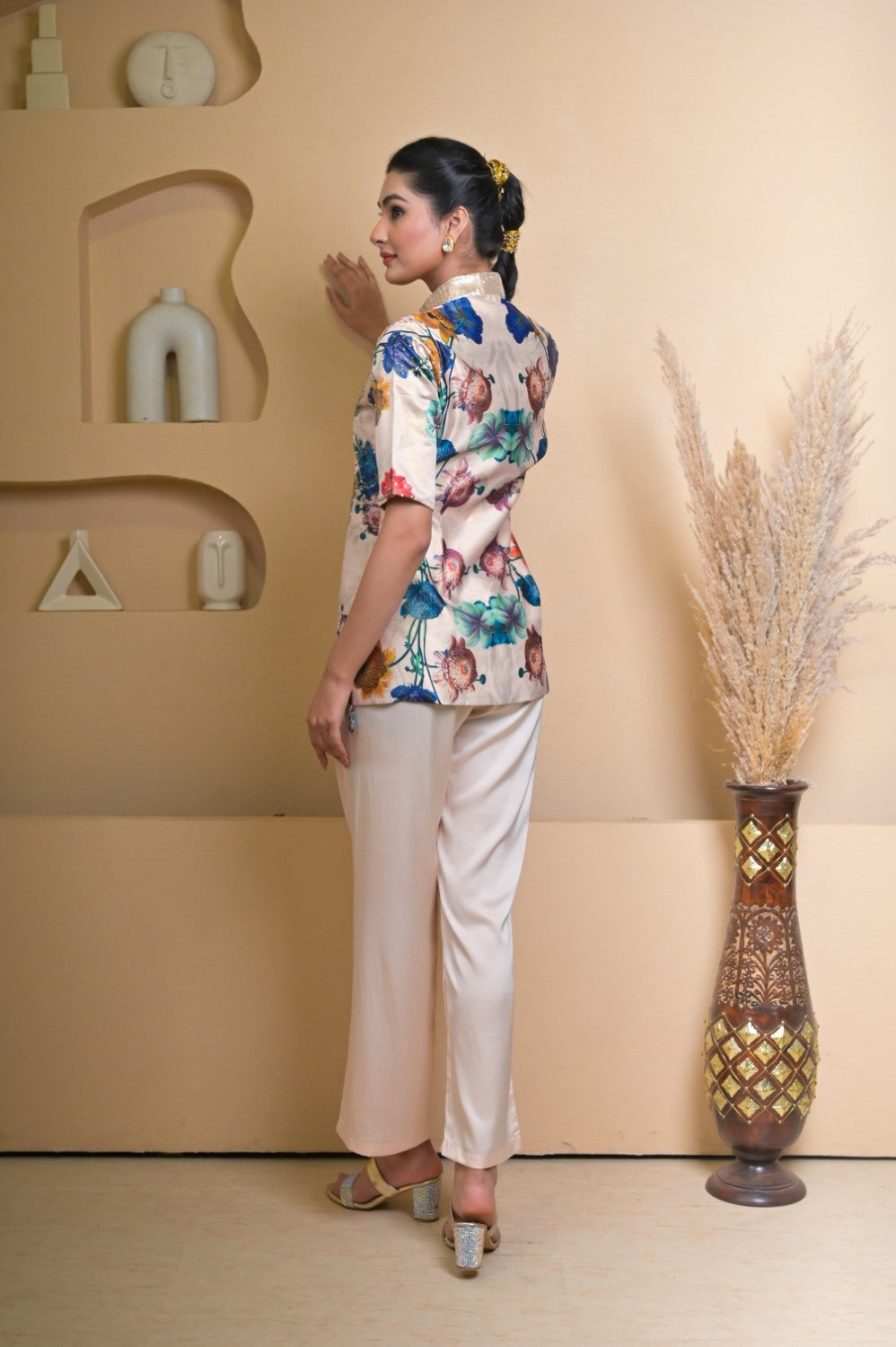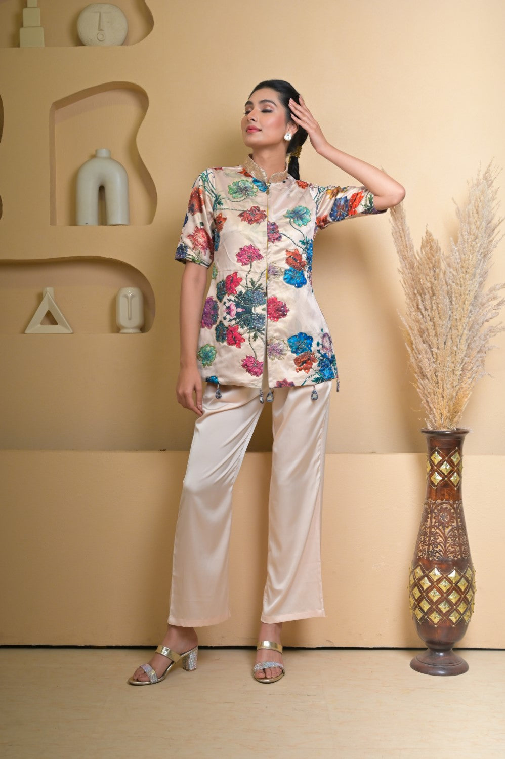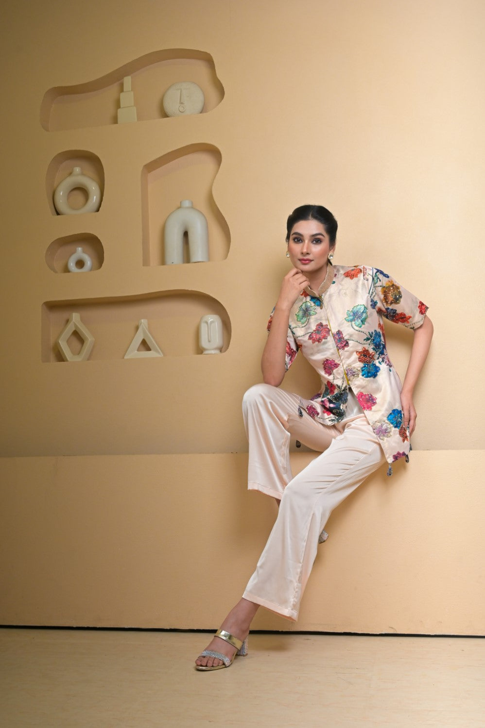 This exquisite ivory coord set boasts intricate handwork floral embroidery on the front, creating a timeless, artisanal look. The design is further enhanced with golden embroidery along the collar, adding a touch of luxury. The stunning mirror tassels in blue at the hem offer a striking contrast, making this set a true statement piece. Paired with straight pants for a sleek and comfortable fit, this set is perfect for any occasion that calls for elegance and style.