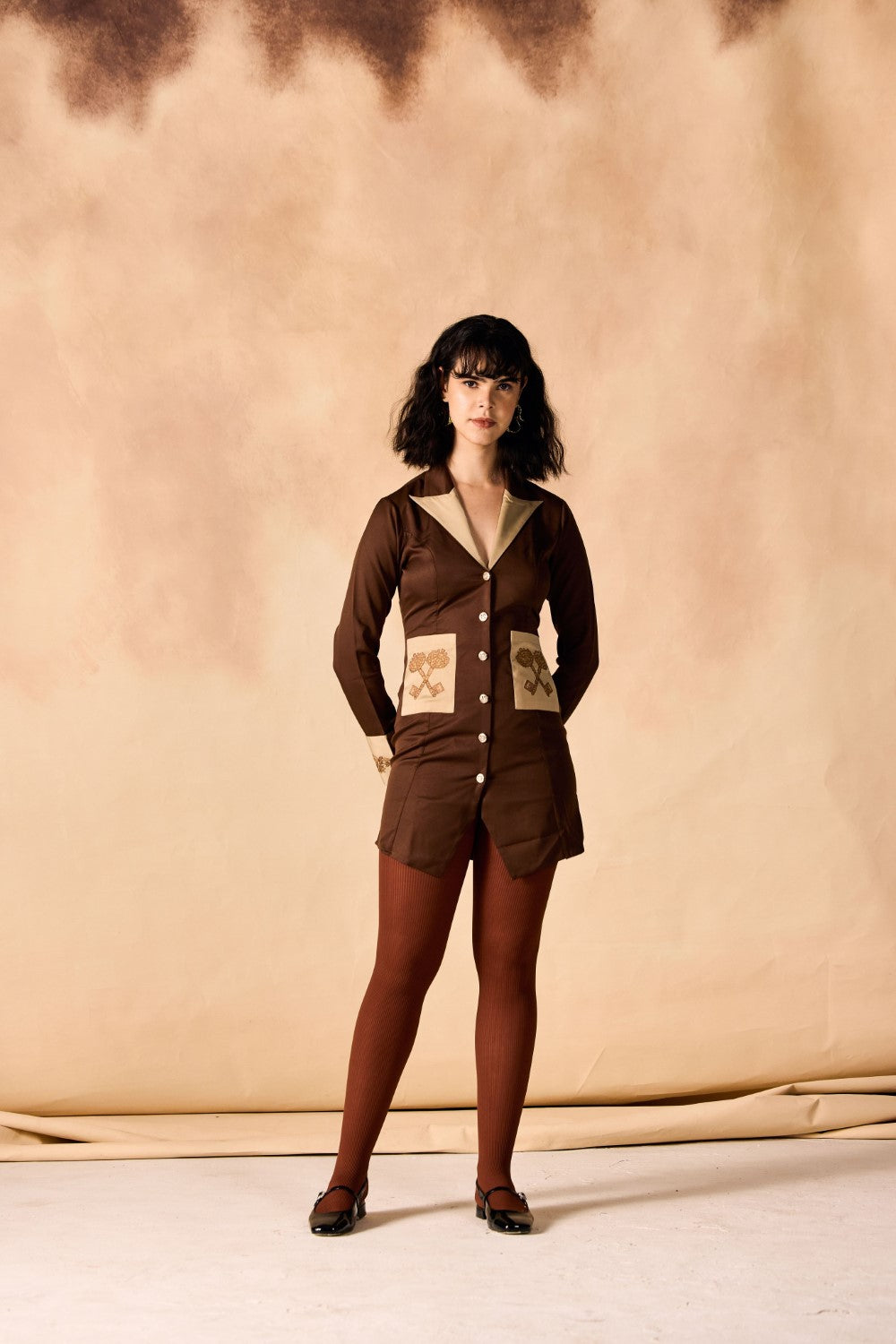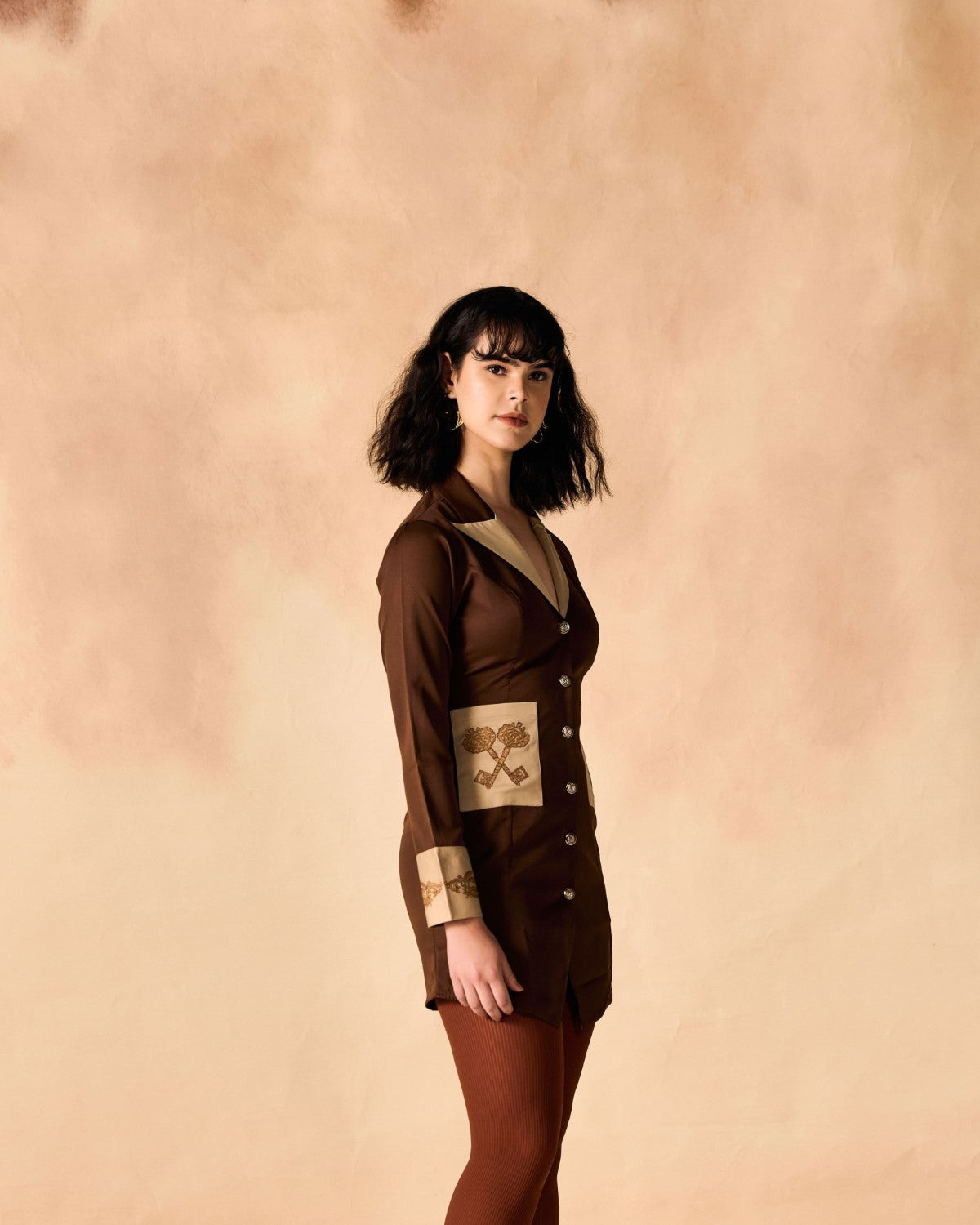 Indulge in vintage charm with lock and key motif embroidery adorning the cuff and pockets of this shirtdress. Perfect for the stylish boss lady, its short length, banana crepe fabric, and two-tone design exude sophistication.